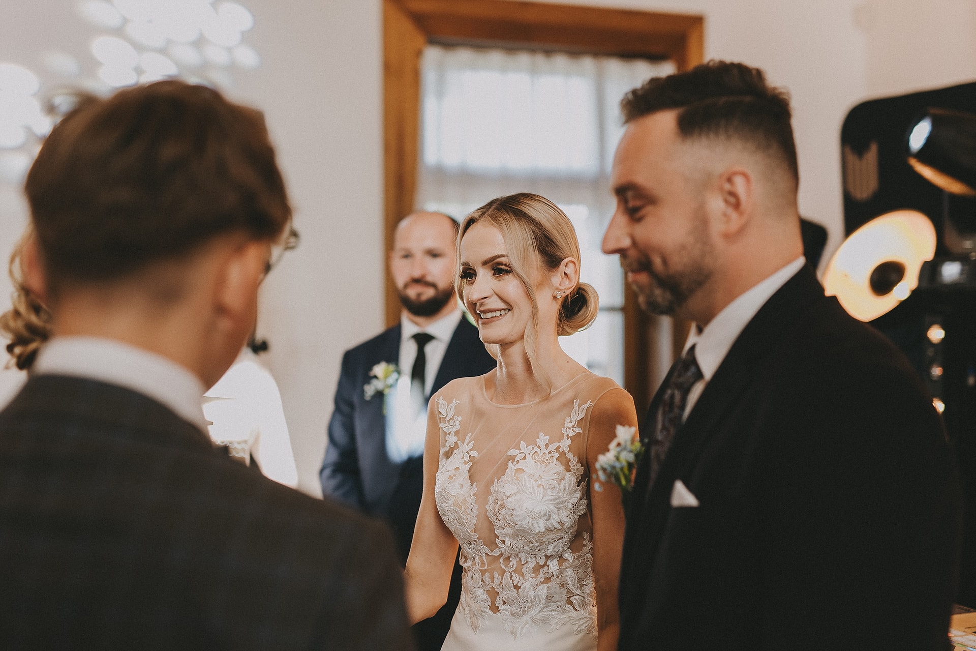 Dzień ślubu rozpoczął się od ceremonii w zabytkowym Kościele z Rogowa, który znajduje się na terenie Muzeum Wsi Kieleckiej w Tokarni. Drewniana świątynia z XVIII wieku ma niepowtarzalny klimat – pachnie historią, a światło wpadające przez małe okna tworzy magiczny nastrój. To miejsce idealne na ślub dla par, które cenią autentyczność i naturalność.