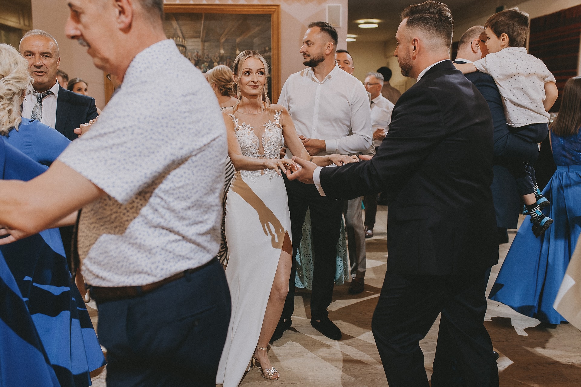 Ania i Dominik w tym otoczeniu wyglądali jak wyjęci z filmowej opowieści – spokojni, uśmiechnięci, otoczeni rodziną i przyjaciółmi. Po ceremonii, wśród braw i śmiechu, wyruszyliśmy kilka kroków dalej – na przyjęcie weselne.